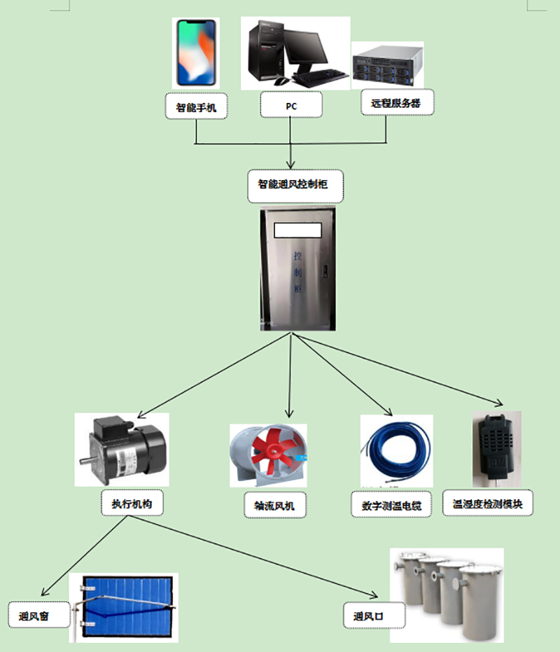 智能通風(fēng)系統(tǒng)綜合運用當(dāng)今先進(jìn)的倉儲管理技術(shù)、電子技術(shù)、計算機(jī)網(wǎng)絡(luò)技術(shù)、人工智能,以及防腐防雷技術(shù)為一體,前端設(shè)備的數(shù)據(jù)采集,控制系統(tǒng)的智能集成整合,終端設(shè)備的智能判斷分析,對以實現(xiàn)在外部條件適宜的情況下對糧倉進(jìn)行通風(fēng),達(dá)到除熱、調(diào)濕等目的,進(jìn)而有效控制糧倉的儲糧環(huán)境,從而達(dá)到安全儲糧的目的。
